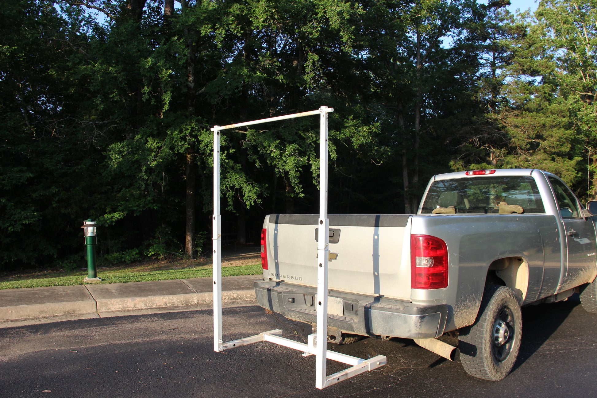 Standing 7' tall by 4' wide, with a footprint of 48" x 32" when fully expanded, the Otto Gem is a full sized weight rack that collapses into a bite size package, only extending 5" beyond the vehicle bumper when collapsed.
