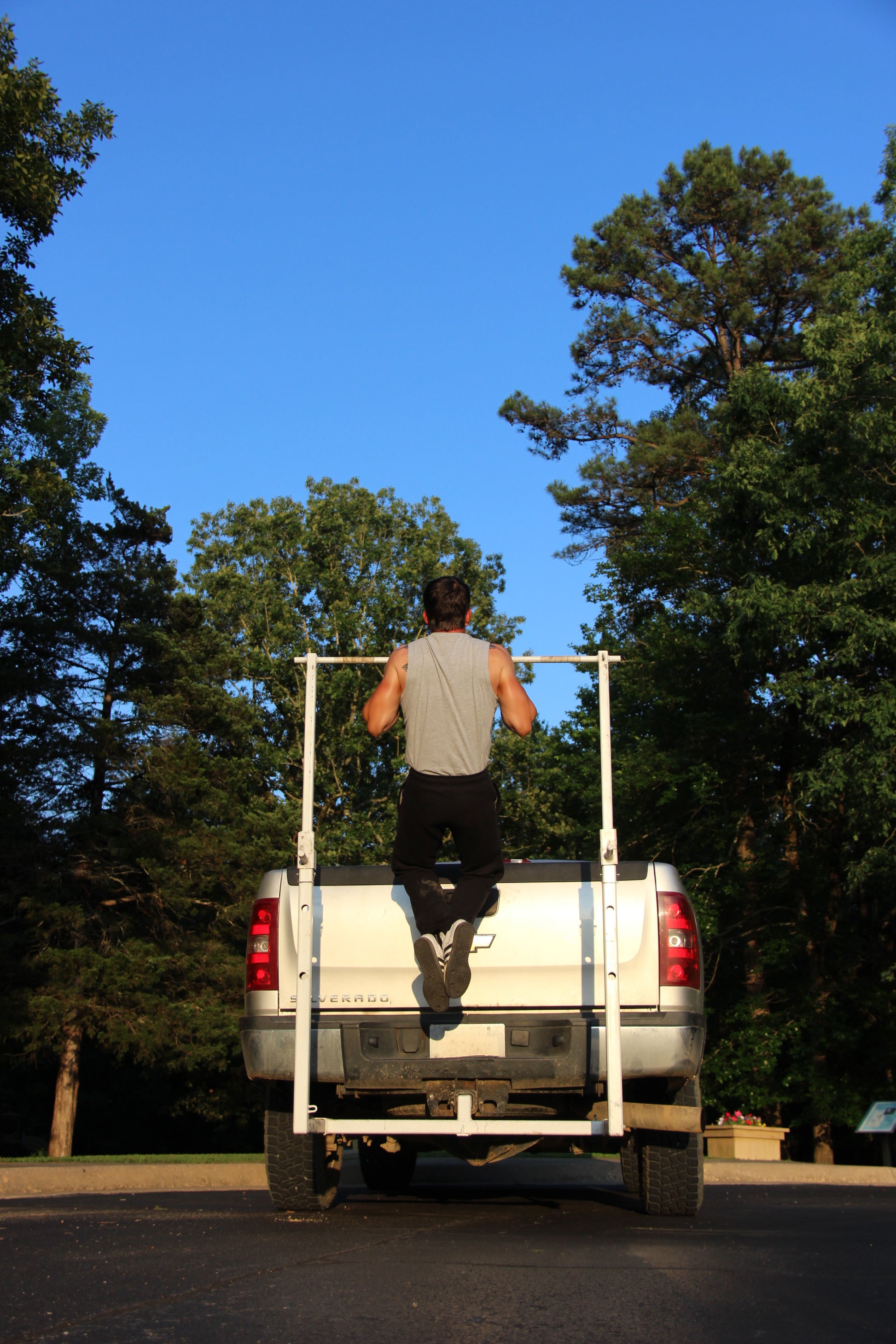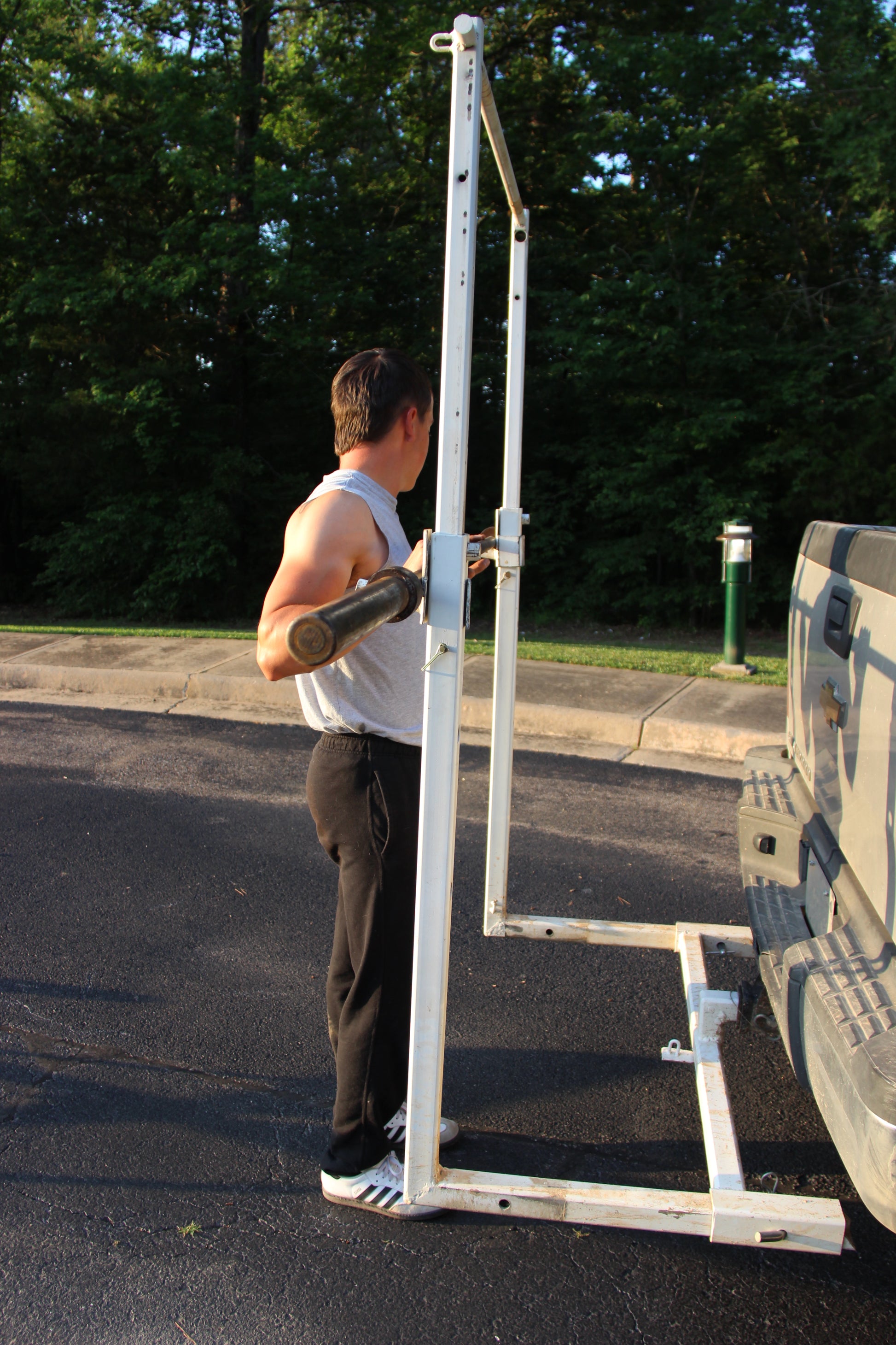 The Otto Gem v.1 is a robust, collapsible weight rack, designed to insert into any standard hitch receiver and expand into a full size rack and pull up bar in seconds!